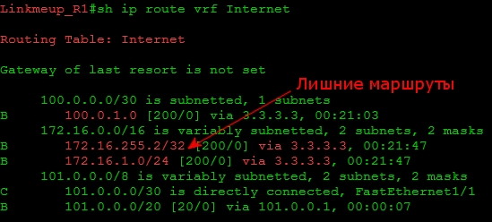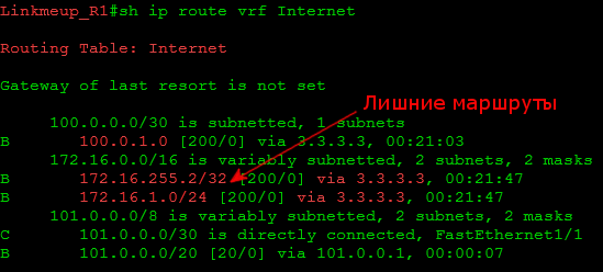 Но что делать с этими лишними маршрутами в VRF Internet? Ведь если мы подключим ещё один VRF так же, у нас и от него появятся ненужные серые подсети.