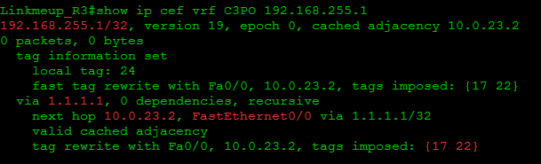 Вы видите здесь метку 22 для FEC 192.168.255.1 и адрес Next Hop 1.1.1.1.