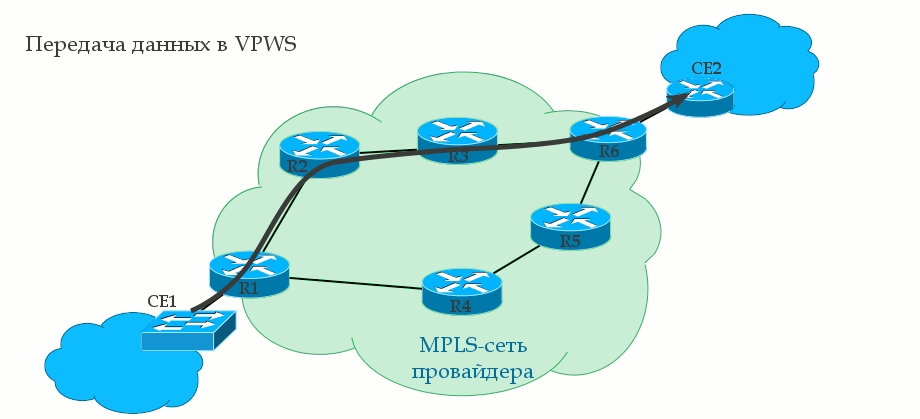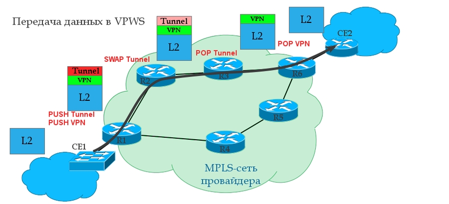 0. Между R1 и R6 уже построен транспортный LSP с помощью протокола LDP или RSVP TE. То есть R1 известна транспортная метка и выходной интерфейс к R6. 1. R1 получает от клиента CE1 некий L2 кадр на AC интерфейс (то может оказаться Ethernet, TDM, ATM итд. — не имеет значения). 2. Этот интерфейс привязан к определённому идентификатору клиента — VC ID — в некотором смысле аналогу VRF в L3VPN. R1 даёт кадру сервисную метку, которая сохранится до конца пути неизменной. VPN-метка является внутренней в стеке. 3. R1 знает точку назначения — IP-адрес удалённого PE-маршрутизатора — R6, выясняет транспортную метку и вставляет её в стек меток MPLS. Это будет внешняя — транспортная метка. 4. Пакет MPLS путешествует по сети оператора через P-маршрутизаторы. Транспортная метка меняется на новую на каждом узле, сервисная остаётся без изменений. 5. На предпоследнем маршрутизаторе снимается транспортная метка — происходит PHP. На R6 пакет приходит с одной сервисной VPN-меткой. 6. PE2, получив пакет, анализирует сервисную метку и определяет, в какой интерфейс нужно передать распакованный кадр.