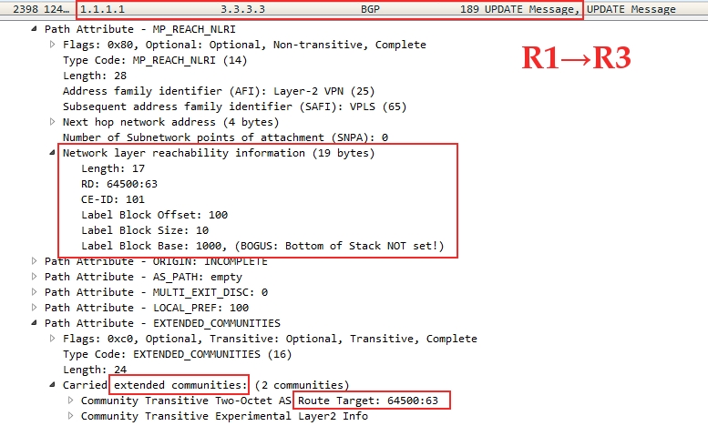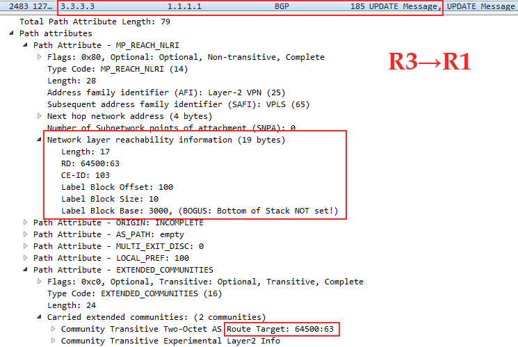 Это Linkmeup_R1 сообщает Linkmeup_R3, как вычислить VPN-метку для трафика, предназначенного ему для VPLS с RT 65400:63. CE-ID (он же VE ID)=101, VBO=100, VBS=10, LB=1000.