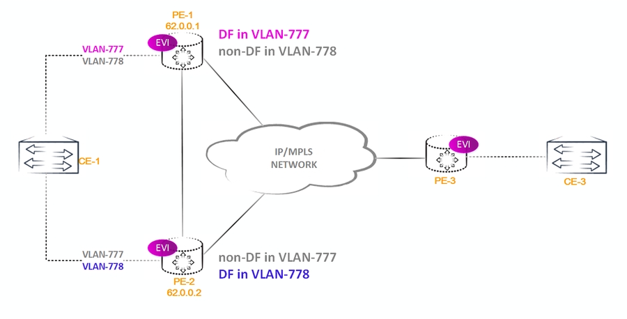 Как нетрудно догадаться, если у нас в сегменте будет два влана например 777 и 778 и два PE маршрутизатора, то в 777 влане DF станет PE1, а в 778 PE2.