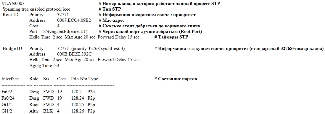 Итак, какую информацию мы можем получить? Так как по умолчанию на современных цисках работает PVST+ (т.е. для каждого влана свой процесс STP), и у нас есть более одного влана, выводится информация по каждому влану в отдельности, каждая запись предваряется номером влана. Затем идет вид STP: ieee значит PVST, rstp — Rapid PVST, mstp то и значит. Затем идет секция с информацией о корневом свиче: установленный на нем приоритет, его mac-адрес, стоимость пути от текущего свича до корневого, порт, который был выбран в качестве корневого (имеет лучшую стоимость), а также настройки таймеров STP. Далее- секция с той же информацией о текущем свиче (с которого выполняли команду). Затем- таблица состояния портов, которая состоит из следующих колонок (слева направо):