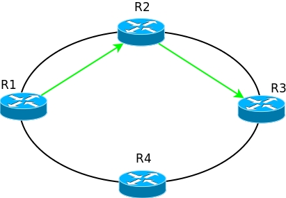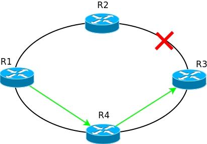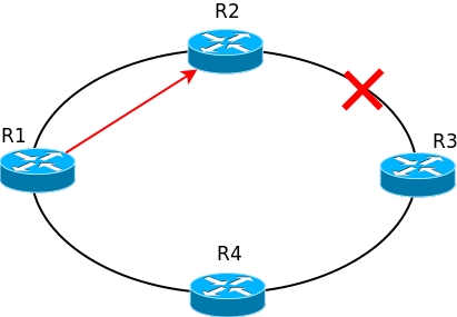 Например, если в такой сети разорвать линк между R2 и R3, то пакеты с R1 будут уходить по прежнему на R2, где будут уничтожены, потому что их некуда отправить.