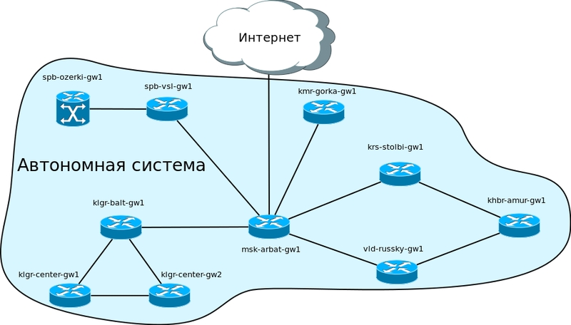 Все протоколы маршрутизации можно разделить на две большие группы: внешние (EGP — Exterior Gateway Protocol) и внутренние (IGP — Interior Gateway Protocol). Чтобы объяснить различия между ними, нам потребуется термин “автономная система”. В общем смысле, автономной системой (доменом маршрутизации) называется группа роутеров, находящихся под общим управлением. В случае нашей обновлённой сети AS будет такой: