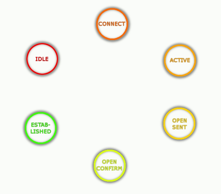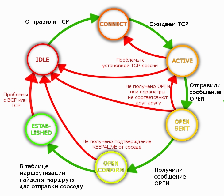 Полная FSM (конечный автомат) для BGP выглядит так: