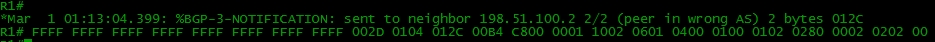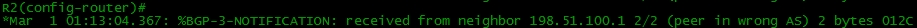 R1 замечает, что AS в сообщении не совпадает с настроенным, и сбрасывает сессиию, отправляя сообщение NOTIFICATION. Они отправляются в случае каких-либо проблем, чтобы разорвать сессию.