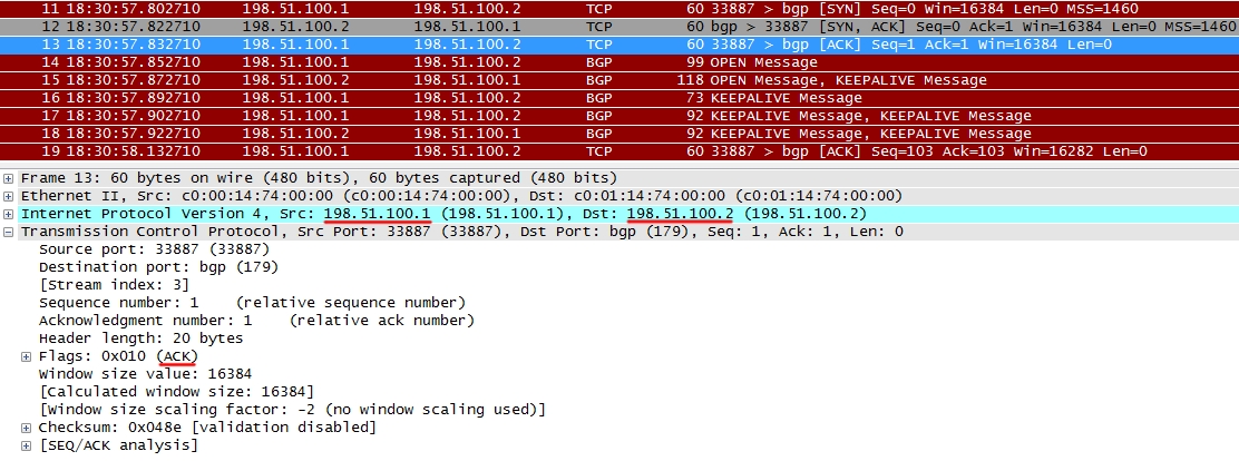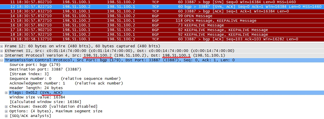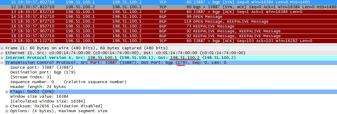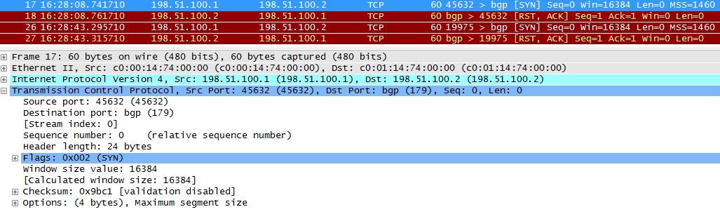 Вот пример неуспешного установления TCP-сессии. BGP будет в состоянии ACTIVE, иногда переключаясь на IDLE и снова обратно. TCP SYN отправлен с R1 на R2.