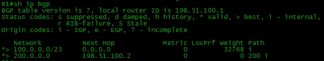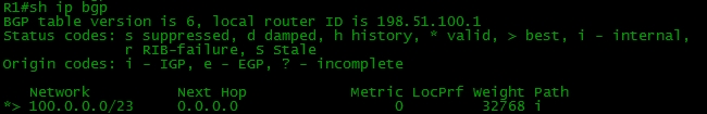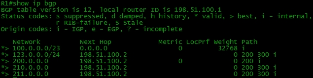 И посмотрим, что из себя представляет таблица маршрутов BGP на маршрутизаторе R1: