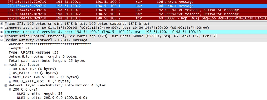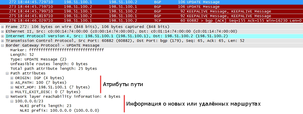 Второй плюсик – это собственно информация о маршрутах – NLRI – Network Layer Reachability Information. Собственно, наша сеть 100.0.0.0/23 тут и указана.