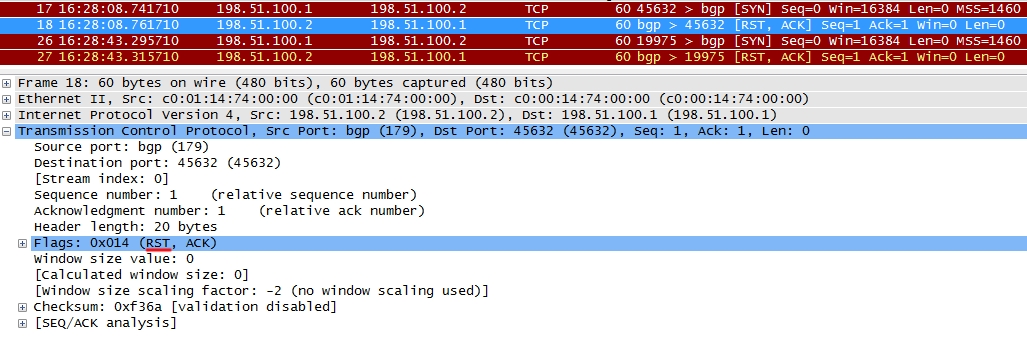 На R2 не запущен BGP, и R2 возвращает ACK, что получен SYN от R1 и RST, означающий, что нужно сбросить подключение.