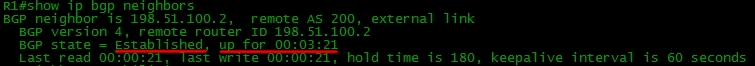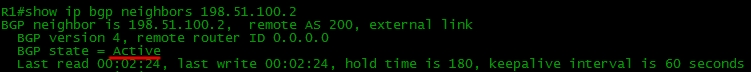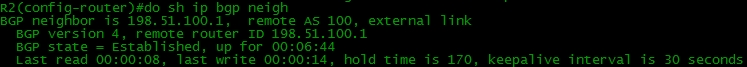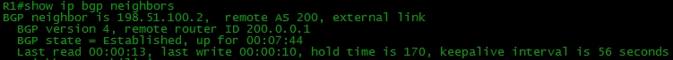 Это означает, что R2 свои Keepalive’ы будет рассылать каждые 30 секунд, а R1 – 56. Но главное, что Hold Timer у них одинаковый, и никто из них раньше времени не разорвёт сессию.