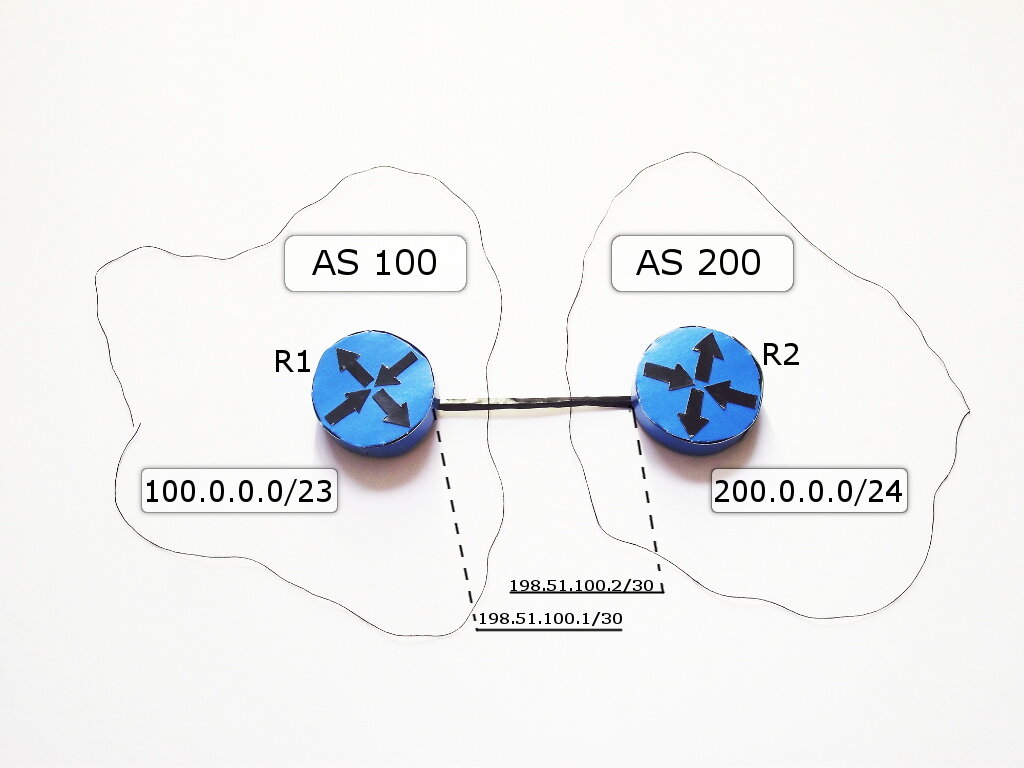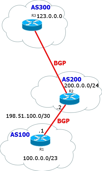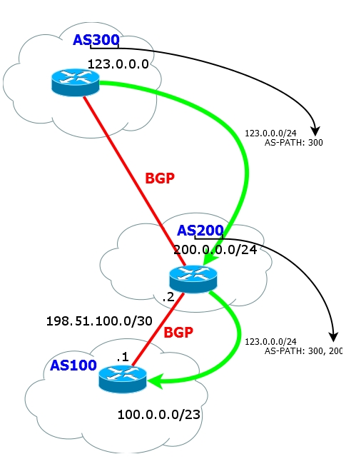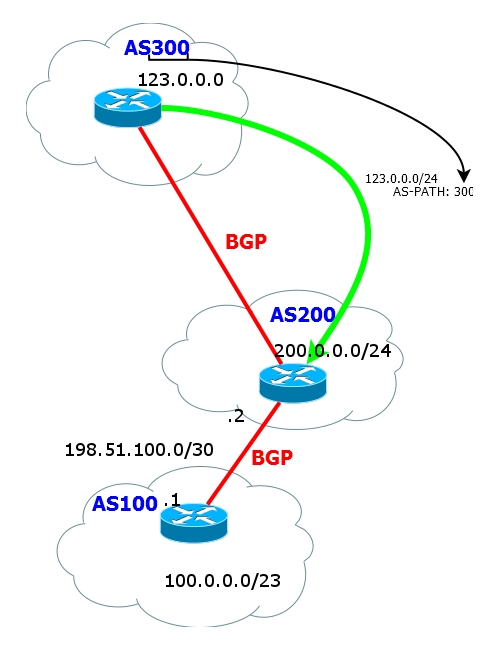 Как видите, маршрут представляет из себя вовсе не только NextHop или просто список устройств до нужной подсети. Это список AS. Иначе он называется AS-Path. То есть, чтобы попасть в сеть 123.0.0.0/24 мы должны отправить пакет наружу, преодолеть AS 200 и AS 300.