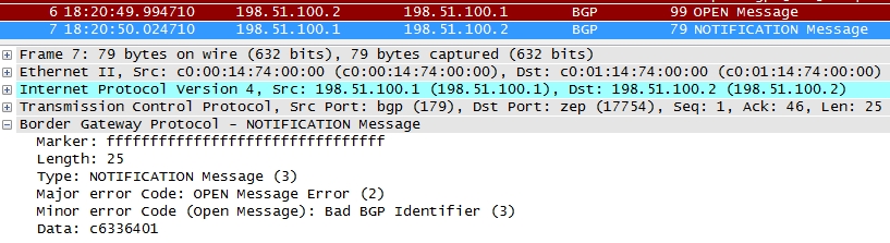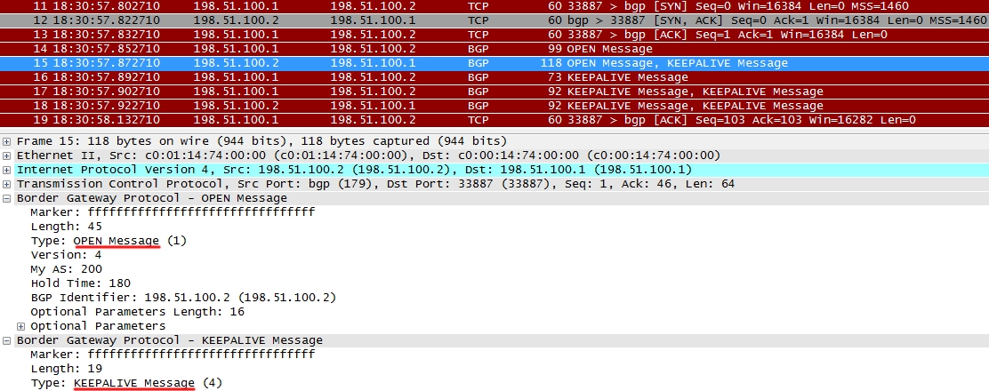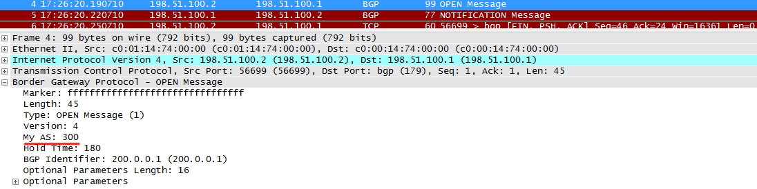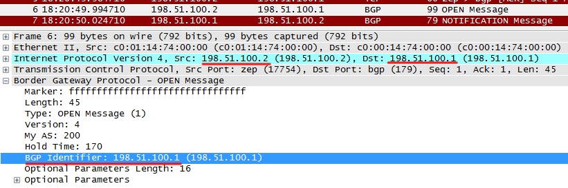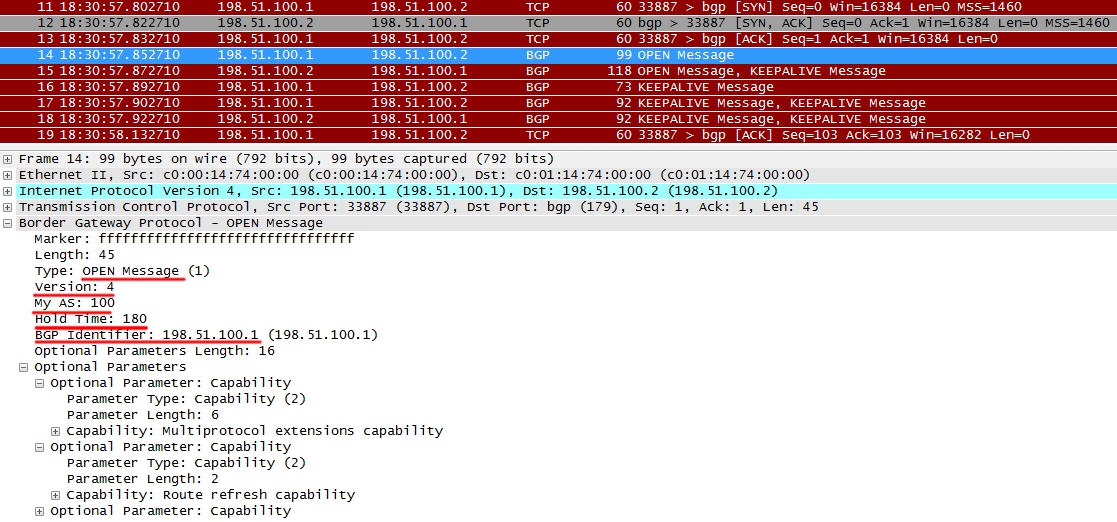 В нём передаются версия протокола, номер AS, Hold Timer и Router ID. Чтобы BGP-сессия поднялась, должны соблюдаться следующие условия: