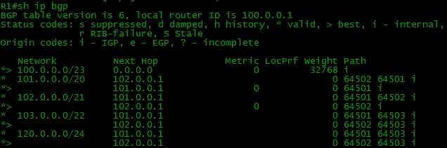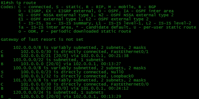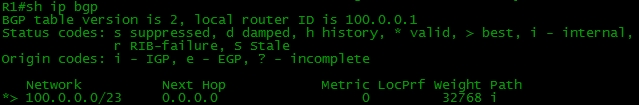 R1(config)#ip route 100.0.0.0 255.255.254.0 Null 0Данный маршрут говорит о том, что все пакеты в эту подсеть будут отброшены. Но, не пугайтесь, нормальная работа не будет нарушена. Если у вас есть более точные маршруты (с маской больше /23, например, /24, /30, /32), то они будут предпочтительнее согласно правилу Longest Prefix Match. И теперь в таблице BGP есть наш локальный маршрут: