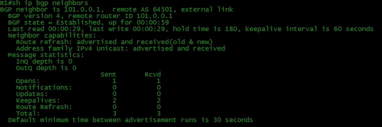 *Mar 1 00:11:12.203: %BGP-5-ADJCHANGE: neighbor 101.0.0.2 Upможно судить, что BGP поднялся, но давайте проверим его состояние: