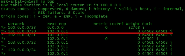 Знак “^” означает, что ASN 200 была добавлена последней, то есть маршрут к нам пришёл из AS 200, но это не значит, что родился он в ней же – знак “_” говорит о том, что это может быть конец списка, а может пробел перед следующей AS.