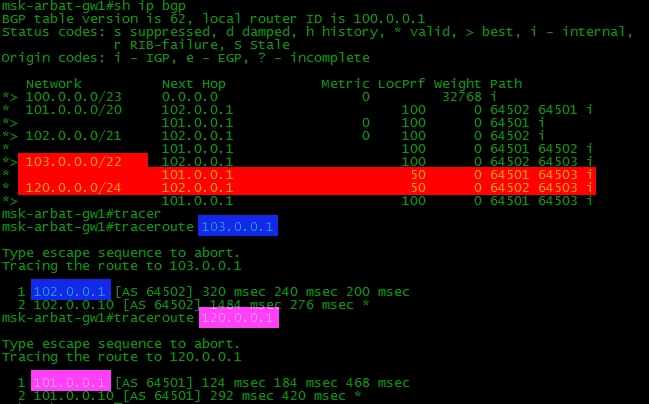 Укажем, что в подсеть 120.0.0.0/24 предпочтительно ходить через Балаган Телеком, а в 103.0.0.0/22 через Филькин Сертификат. Для этого воспользуемся атрибутом Local Preference. Чем выше значение этого параметра, тем выше приоритет маршрута.