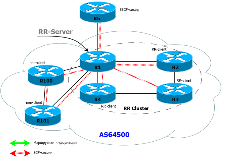 Для данного маршрутизатора клиент — iBGP сосед, который специально объявлен, как RR client, и для которого действуют особые правила. Не-клиент — iBGP сосед, который не объявлен, как RR client RR серверов может быть (и должно быть в плане отказоустойчивости) несколько. И понятия клиент/не-клиент строго локальны для каждого RR-сервера. RR-сервер (или несколько) в совокупности с со своими клиентами формируют кластер.