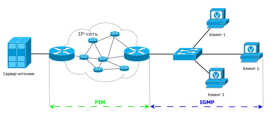 Вообще, чтобы доставить мультикаст от источника до получателя на данный момент существует много протоколов — IGMP/MLD, PIM, MSDP, MBGP, MOSPF, DVMRP. Мы остановимся на двух из них, которые используются в настоящее время: PIM и IGMP. С помощью IGMP конечные получатели-клиенты сообщают ближайшим маршрутизаторам о том, что хотят получать трафик. А PIM строит путь движения мультикастового трафика от источника до получателей через маршрутизаторы.