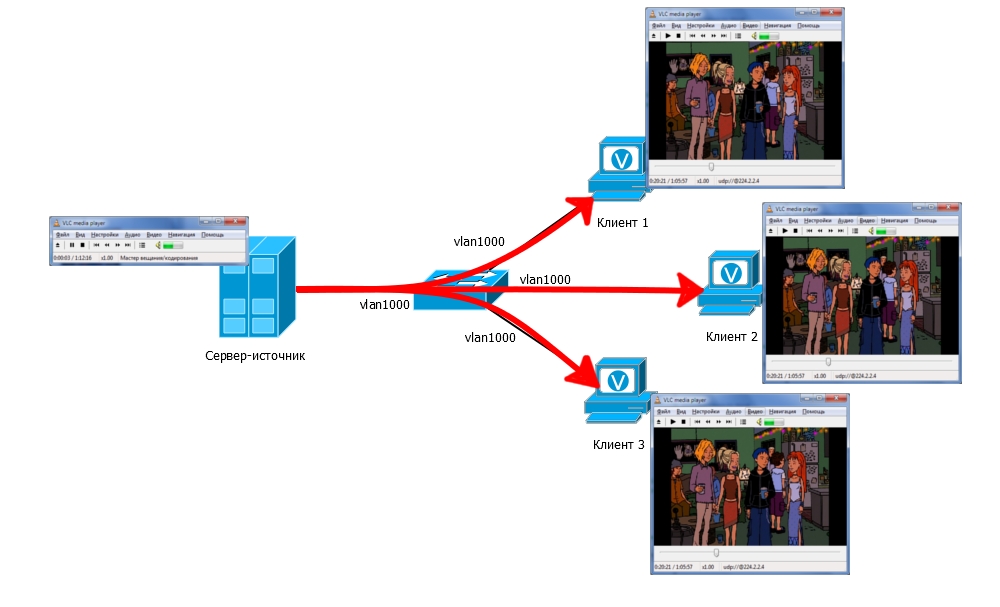 Мультикастовый сервер по-прежнему вещает для группы 224.2.2.4. На коммутаторе все 4 порта должны быть в одном VLAN. Трафик приходит на коммутатор и по умолчанию рассылается во все порты одного VLAN'а. Значит все клиенты получают этот трафик. На них на всех в видеопроигрывателе так же указан групповой адрес 224.2.2.4. Собственно, все эти устройства становятся членами данной мультикастовой группы. Членство в ней динамическое: кто угодно, в любой момент может войти и выйти из неё.