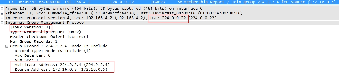 Версия 3 поддерживает всё то, что поддерживает IGMPv2, но есть и ряд изменений. Во-первых, Report отправляется уже не на адрес группы, а на мультикастовый служебный адрес 224.0.0.22. А адрес запрашиваемой группы указан только внутри пакета. Делается это для упрощения работы IGMP Snooping, о котором мы поговорим дальше.