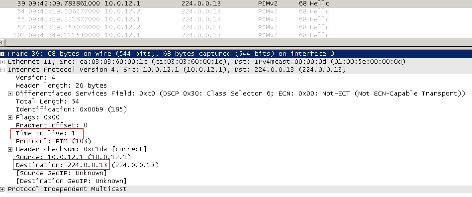 Первое, что делает PIM — устанавливает соседство. Для этого используются сообщения PIM Hello. При активации PIM на интерфейсе с него отправляется PIM Hello на адрес 224.0.0.13 с TTL равным 1. Это означает, что соседями могут быть только маршрутизаторы, находящиеся в одном широковещательном домене.