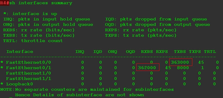 На интерфейс FE0/1 приходит 362000 б/с, и через интерфейс FE0/0 они передаются.