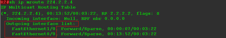 Итак, R2 — наш RP — сейчас знает о том, что за FE0/0 и FE1/0 у него есть получатели для группы 224.2.2.4. Причём неважно, сколько их там — по одному за каждым интерфейсом или по сто — поток трафика всё равно будет один на интерфейс.