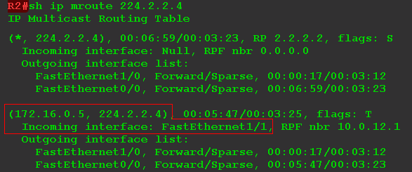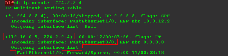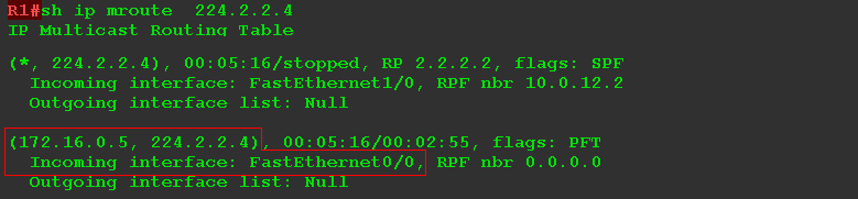 Появилась запись (S, G) — (172.16.0.5, 224.2.2.4). Распакованные пакеты RP дальше отправляет в RPT в интерфейсы FE0/0 и FE1/0, по которому трафик доходит до клиентов.