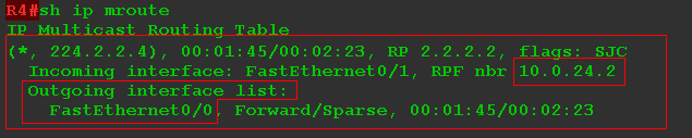 Здесь видно восходящий интерфейс FE0/1, но это не значит, что R4 получает трафик для группы 224.2.2.4. Это говорит лишь о том, что единственное место, откуда сейчас он может получать — FE0/1, потому что именно там находится RP. Кстати, здесь же указан и сосед, который прошёл RPF-Check — R2: 10.0.2.24. Ожидаемо.