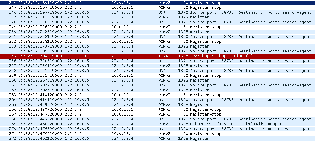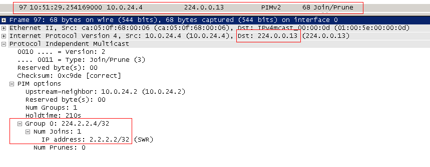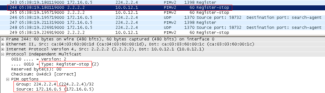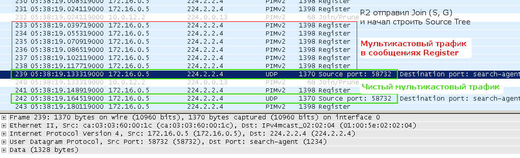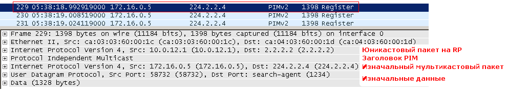 Обратите внимание на стек протоколов. Поверх юникастового IP и заголовка PIM идёт изначальный мультикастовый IP, UDP и данные. Теперь, в отличие от всех других, пока известных нам сообщений PIM, в адресе получателя указан 2.2.2.2, а не мультикастовый адрес.