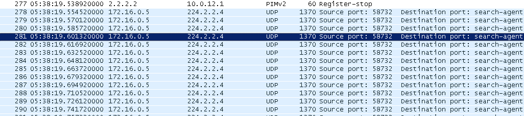 5) Теперь врубаем сервер. Как мы уже выше обсуждали, он не волнуется о PIM, RP, IGMP — он просто вещает. А R1 получает этот поток. Его задача — доставить мультикаст до RP. В PIM есть специальный тип сообщений — Register. Он нужен для того, чтобы зарегистрировать источник мультикаста на RP. Итак, R1 получает мультикастовый поток группы 224.2.2.4: