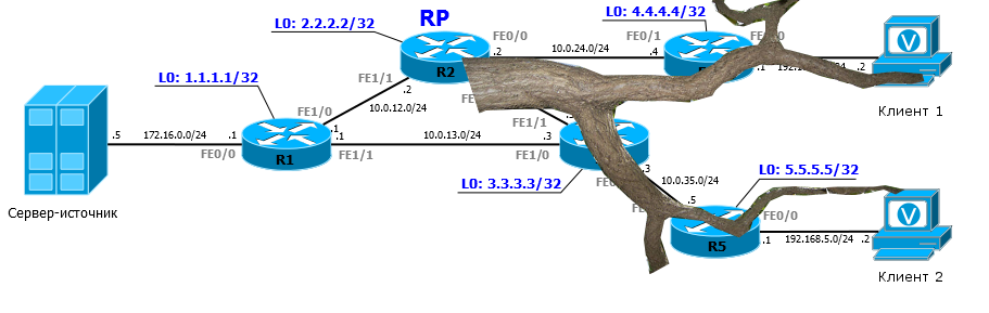 Если Клиент 2 тоже захочет получать мультикастовый трафик для той же группы, R5 отправит PIM Join в FE0/1, потому что за ним находится RP, R3, получив его, формирует новый PIM Join и отправляет в FE1/1 — туда, где находится RP. То есть Join путешествует так узел за узлом, пока не доберётся до RP или до другого маршрутизатора, где уже есть клиенты этой группы.