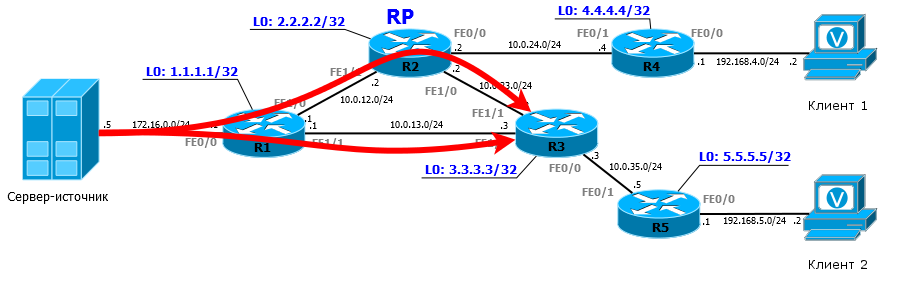 Получив такой Join, R3 отправляет его не на RP, как делал это с обычным Join (*, G), а в сторону источника (через интерфейс согласно таблице маршрутизации). То есть в данном случае R3 отправляет Join (172.16.0.5, 224.2.2.4) в интерфейс FE1/0.
