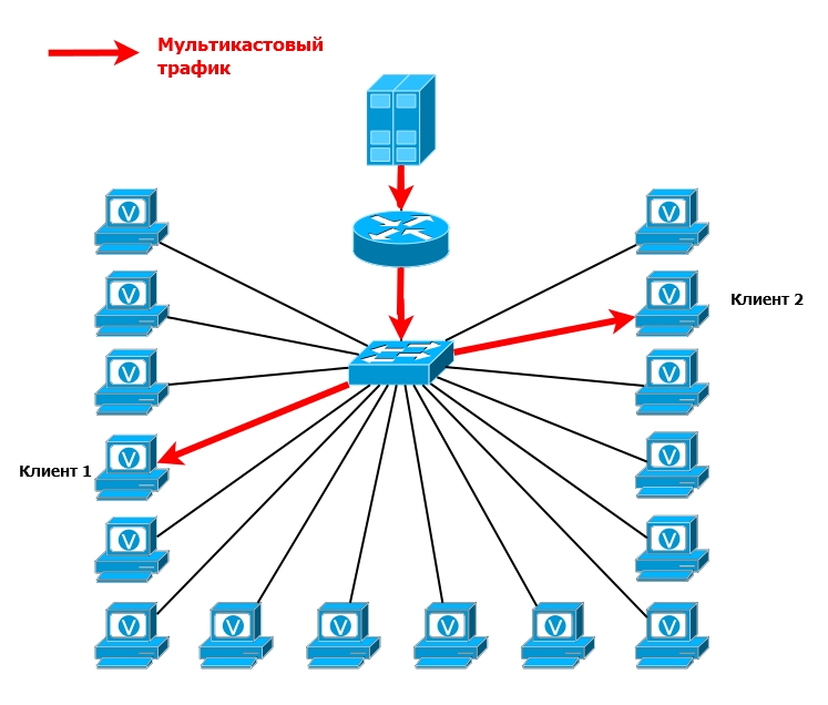 Таким образом формируется таблица передачи мультикастового трафика на канальном уровне. В итоге, когда сверху приходит мультикастовый поток, он копируется только в нисходящие интерфейсы. Если на 16-портовом коммутаторе только два клиента, только им и будет доставлен трафик.