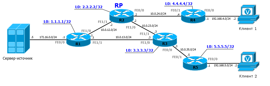 Сервер 172.16.0.5 передает мультикаст трафик на группы 239.1.1.1, 239.2.2.2 и 239.0.0.x. Настроить сеть таким образом, чтобы: — клиент 1 не мог присоединиться к группе 239.2.2.2. Но при этом мог присоединиться к группе 239.0.0.x. — клиент 2 не мог присоединиться к группе 239.1.1.1. Но при этом мог присоединиться к группе 239.0.0.x.