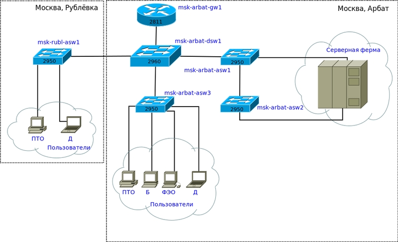 На представленной схеме ядром (Core) будет маршрутизатор 2811, коммутатор 2960 отнесём к уровню распространения (Distribution), поскольку на нём агрегируются все VLAN в общий транк. Коммутаторы 2950 будут устройствами доступа (Access). К ним будут подключаться конечные пользователи, офисная техника, сервера.