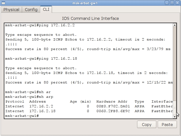 msk-arbat-gw1(config)#ip route 172.16.16.0 255.255.248.0 172.16.2.2Проверяем: